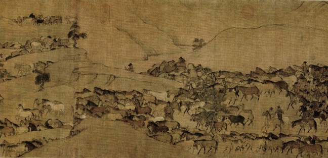 Li Gonglin (李公麟)(1049 – 1106) After Wei Yan’s Pasturing horses (臨韋偃牧放圖), ink and watercolour on silk, 46.2 x 429.8 cm, (only a portion is shown), Palace Museum (故宫博物院)