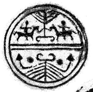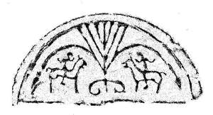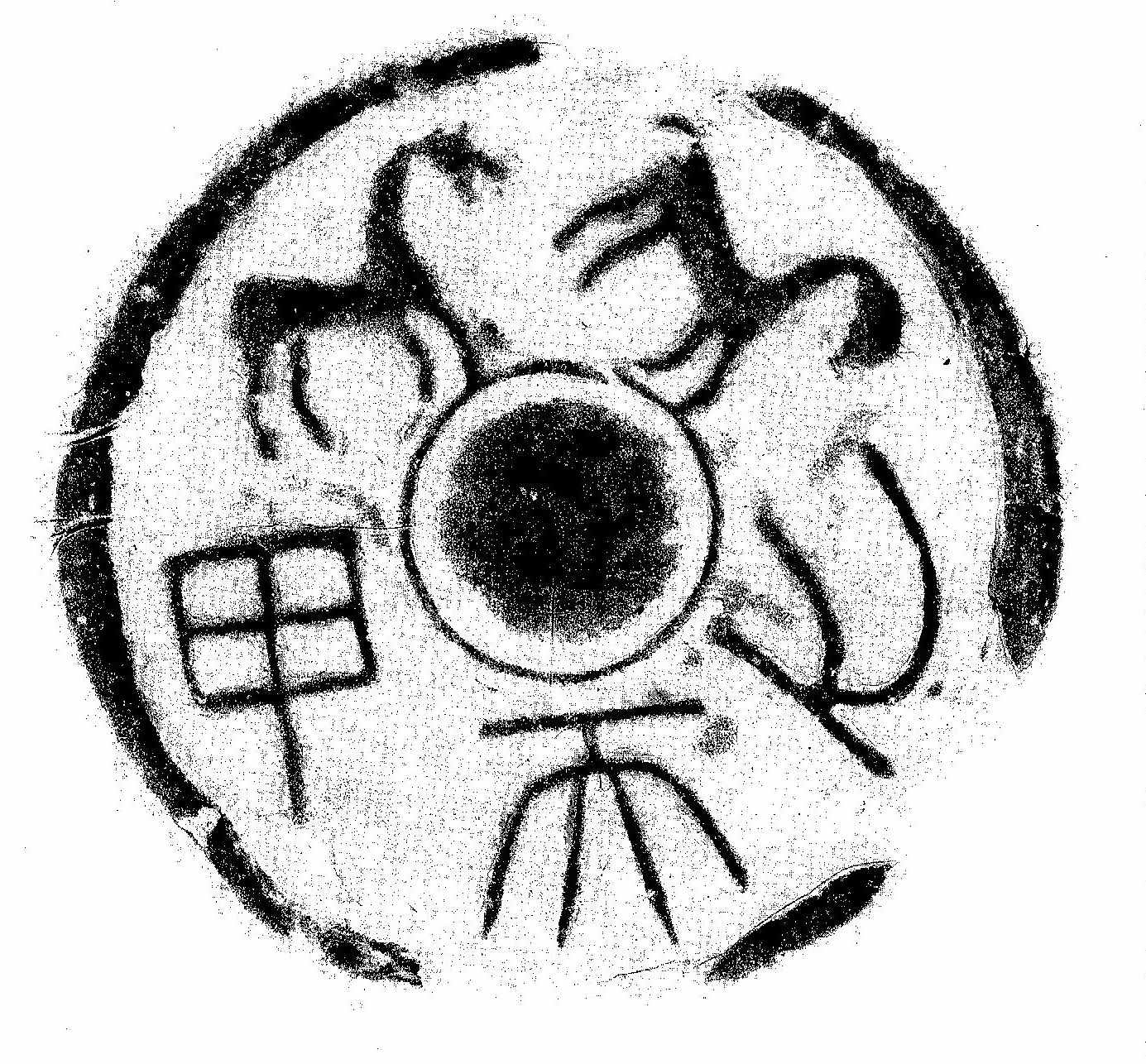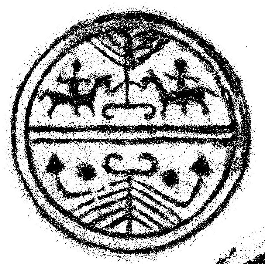 Warring States (戰國時代) (467 BCE – 221 BCE), ink-rubbing of double-rider (雙騎) half-tile end, unearthed from the ruins of the ancient Qi city of Linzi (臨淄齊故城遺址), diameter 14 cm, height 6.7 cm