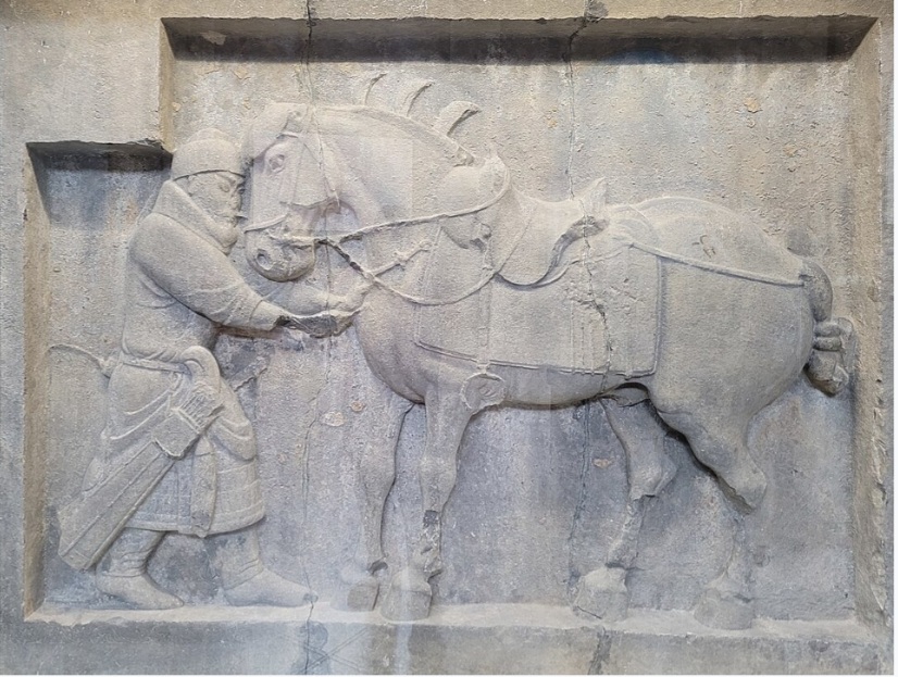 One of Tang stone relief sculpture of Emperor Taizong’s (唐太宗) warhorses, 250 m x 300 cm each, commissioned around 636-649 CE. The horse named Saluzi (or Purple Gallop)(颯露紫), Penn Museum