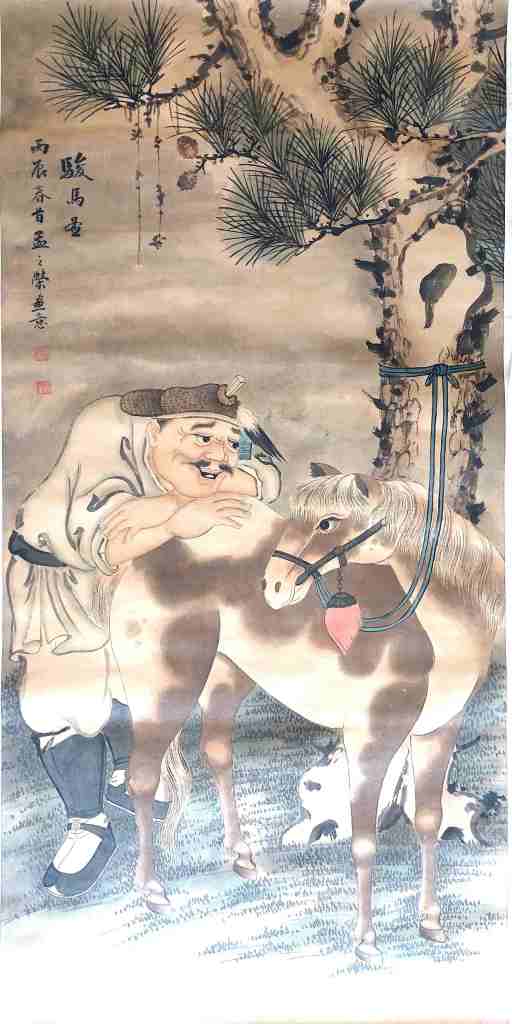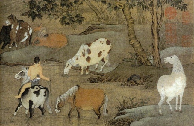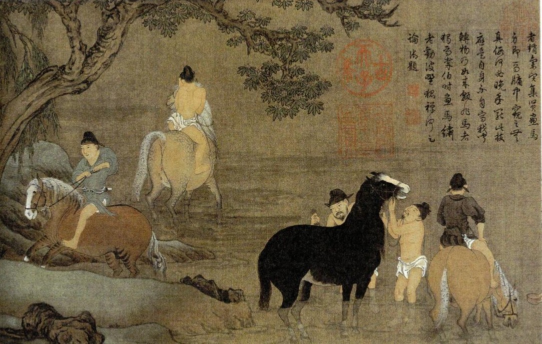 Zhao Mengfu (趙孟頫)(1254 – 1322) Horse bathing (浴馬圖) , handscroll, ink and watercolour on silk, 28.5 x 154 cm), only a portion is shown, Palace Museum (故宮博物院)Same as above, only a portion is shown.