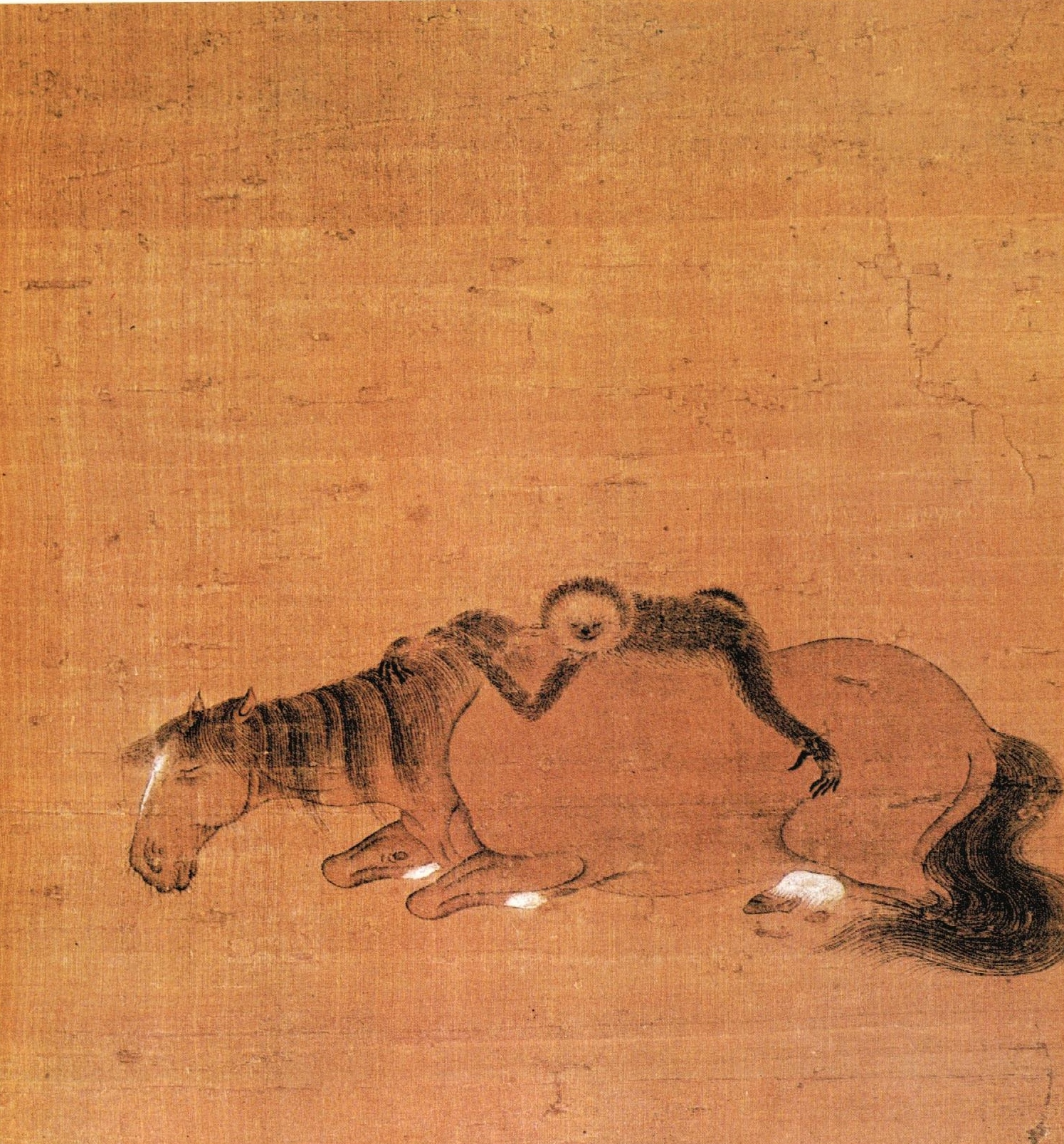 Place the crazy monkey (fēng hóu 瘋猴) on (shàng 上) the back (hóu 後) of a horse (mǎ 馬) sounds exactly like ‘mǎ shàng fēng hóu‘ (馬上封侯): ‘May you quickly be made a high official’ (mǎ shàng meaning either ‘on the horse’ or ‘right away, immediately).