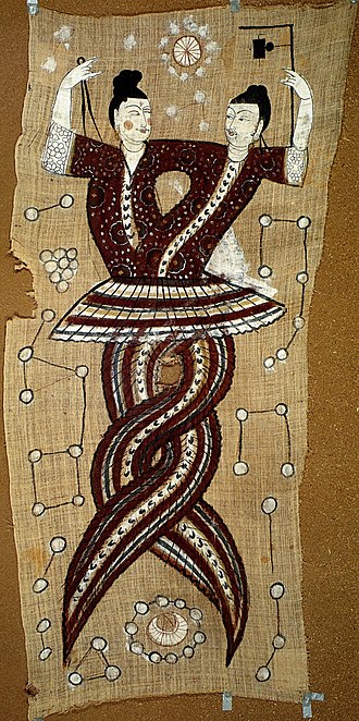 According to one version of the legends, Huaxu (華胥) gave birth to a twin brother and sister, Fuxi (伏羲) and Nüwa (女媧). Fuxi and Nüwa are said to be creatures that have faces of human and bodies of snakes. It was believed that they worshipped snakes.