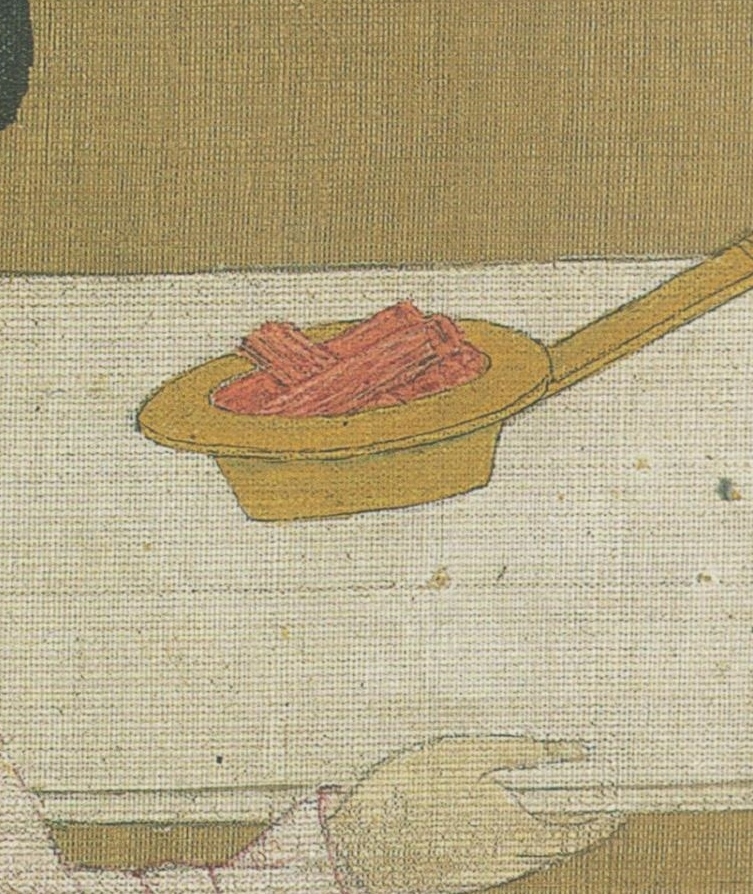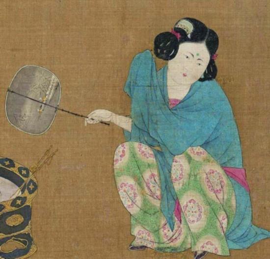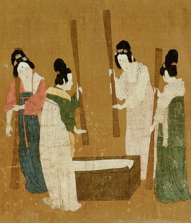 The painting portrays nine luxuriously adorned court ladies, two maids and a young girl working on newly woven silk in what is called ‘palace sericulture’ (gongcan 貢繭), an annual symbolic imperial rite to ensure a year’s plentiful production in silk. They formed three groups with each engaging in a distinct task related to silk production: pounding, sewing and ironing.