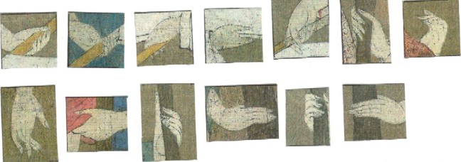 Again, the four figures stretching and ironing the silk are standing in a diamond-shaped formation to create a three-dimensional effect.